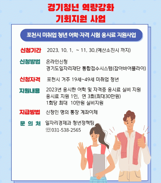 [HKSÇàÁ¤¹æ¼Û]Æ÷õ½Ã´Â ¿À´Â 11¿ù 30ÀϱîÁö 2023³â ¡®°æ±âû³â ¿ª·® °È ±âȸ Áö¿ø »ç¾÷¡¯ÀÇ ÇϹݱ⠡®¹ÌÃë¾÷ û³â ¾îÇС¤ÀڰݽÃÇè ÀÀ½Ã·á Áö¿ø»ç¾÷¡¯À» Á¢¼öÇÑ´Ù°í ¹àÇû´Ù.