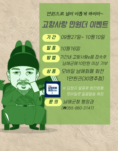 [HKSÇàÁ¤¹æ¼Û] ³²ÇرºÀº 9¿ù 27ÀϺÎÅÍ 10¿ù 10ÀϱîÁö Ãß÷À» ÅëÇØ 10¸¸ ¿ø ÀÌ»ó °íÇâ»ç¶û ±âºÎÀÚ 30¸í¿¡°Ô ³²ÇØ»ç¶û»óǰ±Ç(1¸¸¿ø)À» Áö±ÞÇÑ´Ù°í ¹àÇû´Ù.