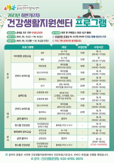 [HKSÇàÁ¤¹æ¼Û]È«¼º±º °Ç°»ýȰÁö¿ø¼¾ÅÍ´Â ¿À´Â 10¿ù 4ÀϺÎÅÍ 11ÀϱîÁö È«ºÏÀ¾ °ÅÁÖ ÁֹΠ´ë»ó ¡®ÇϹݱâ 2Â÷ ½ÅüȰµ¿ ÇÁ·Î±×·¥¡¯ Âü¿©ÀÚ¸¦ ¸ðÁýÇÑ´Ù. À̹ø ÇϹݱâ ÁÖ¿ä ÇÁ·Î±×·¥Àº ¡ã¾ÆÀÌÆ°Æ° ¼ºÀå±³½Ç(³îÀÌÇü ½ÅüȰµ¿) ¡ã±Â¹Ùµð º¸¿©µå¡¦