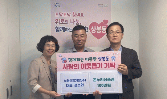 [HKSÇàÁ¤¹æ¼Û]»óºÀµ¿ ÇàÁ¤º¹Áö¼¾ÅÍ´Â 21ÀÏ ºÎ¿µ»ê¾÷°³¹ß(ÁÖ) Á¤¼ÒÈ ´ëÇ¥°¡ Ãß¼® ¸íÀýÀ» ¸Â¾Æ °ü³» µµ¿òÀÌ ÇÊ¿äÇÑ ÀÌ¿ô¿¡ Àü´ÞÇØ´Þ¶ó¸ç ÁøÁÖ-»êû»ó»ý»óǰ±Ç 100¸¸ ¿ø »ó´çÀ» ±âŹÇß´Ù°í ¹àÇû´Ù.