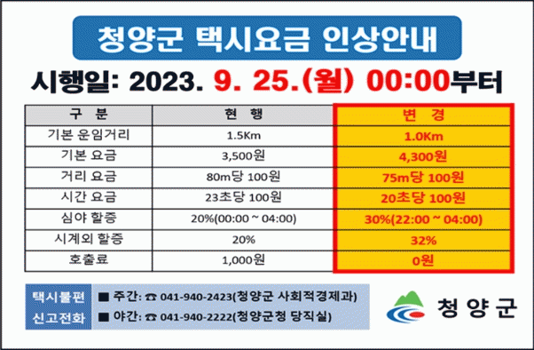 [HKSÇàÁ¤¹æ¼Û]û¾ç±ºÀÌ ¿À´Â 25ÀϺÎÅÍ ÁßÇüÅýà ±âº»¿ä±ÝÀ» 3,500¿ø¿¡¼ 4,300¿øÀ¸·Î ÀλóÇÏ°í ±âº»°Å¸®µµ 1.5km¿¡¼ 1km·Î º¯°æÇÑ´Ù°í 14ÀÏ ¹àÇû´Ù.