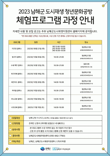 [HKSÇàÁ¤¹æ¼Û]³²ÇرºÀº µµ½ÃÀç»ý»ç¾÷À¸·Î ÁøÇàµÇ´Â ¡®2023 û³â¹®È°ø¹æ üÇèÇÁ·Î±×·¥¡¯À» ¿À´Â 11¿ù11ÀϱîÁö ÃÑ 9°³ °úÁ¤À¸·Î ¿î¿µÇÑ´Ù°í ¹àÇû´Ù.