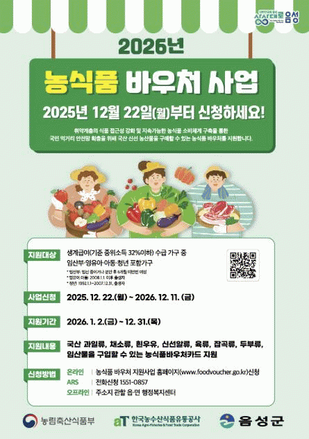 [HKSÇàÁ¤¹æ¼Û]À½¼º±ºÀº Ãë¾à°èÃþÀÌ ½Å¼± ³ó»ê¹°À» ±¸¸ÅÇÒ ¼ö ÀÖ´Â Ä«µå¸¦ Áö¿øÇÏ´Â ¡®2026³â ³ó½Äǰ ¹Ù¿ìó »ç¾÷¡¯ÀÇ ½ÅûÀ» ¹Þ°í ÀÖ´Ù. Áö¿ø ´ë»óÀº »ý°è±Þ¿© ¼ö±Þ°¡±¸(±âÁØ ÁßÀ§¼Òµæ 32% ÀÌÇÏ) Áß ÀÓ»êºÎ¡¤¿µÀ¯¾Æ¡¤¾Æµ¿¡¤Ã»³â(1992.1.¡¦