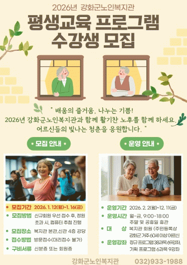 [HKSÇàÁ¤¹æ¼Û]°È±º³ëÀκ¹Áö°ü(°üÀå À±½É)ÀÌ ¿À´Â 12ÀÏ~16ÀÏ, ¾î¸£½ÅµéÀÇ È°±âÂù ³ëÈÄ¿Í Æò»ýÇнÀ ±âȸ È®´ë¸¦ À§ÇÑ ¡®2026³â Æò»ý±³À° ÇÁ·Î±×·¥¡¯ ¼ö°»ýÀ» ¸ðÁýÇÑ´Ù°í ¹àÇû´Ù.