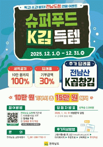 [HKSÇàÁ¤¹æ¼Û]Àü¶ó³²µµ°¡ ¿¬¸»À» ¸Â¾Æ °íÇâ»ç¶û±âºÎÁ¦ Âü¿© È®´ë¿Í Áö¿ª ¼ö»ê¹° ¼Òºñ ÃËÁøÀ» À§ÇØ ½´ÆÛǪµå ÄÉÀÌ(K)±èÀ» Ȱ¿ëÇÑ ´ë±Ô¸ð ¿¬¸» À̺¥Æ®¸¦ ÁøÇàÇÑ´Ù.