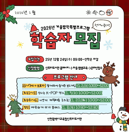 [¼öµµ±Ç] ÀÎõ±¤¿ª½Ã±³À°Ã»½ÅÆ®¸®µµ¼°ü, °Ü¿ï¹æÇРƯº°ÇÁ·Î±×·¥ ÇнÀÀÚ ¸ðÁý |2025. 12.24