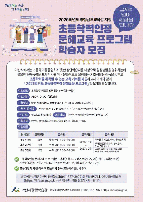 [HKSÇàÁ¤¹æ¼Û]¾Æ»ê½Ã´Â ÃʵîÇб³ °úÁ¤À» ¸¶Ä¡Áö ¸øÇÑ ¼ºÀÎÀ» ´ë»óÀ¸·Î »ýȰ Àü¹Ý¿¡ ÇÊ¿äÇÑ ±âÃÊ ¹®ÇØ ´É·Â°ú »çȸ¡¤¹®ÈÀû ÀûÀÀ ¿ª·®À» ±â¸¦ ¼ö ÀÖµµ·Ï ¡®2026Çг⵵ ÃʵîÇзÂÀÎÁ¤ ¹®Çر³À° ÇÁ·Î±×·¥¡¯À» ¿î¿µÇϰí, ÀÌ¿¡ Âü¿©ÇÒ ÇнÀÀÚ¸¦¡¦