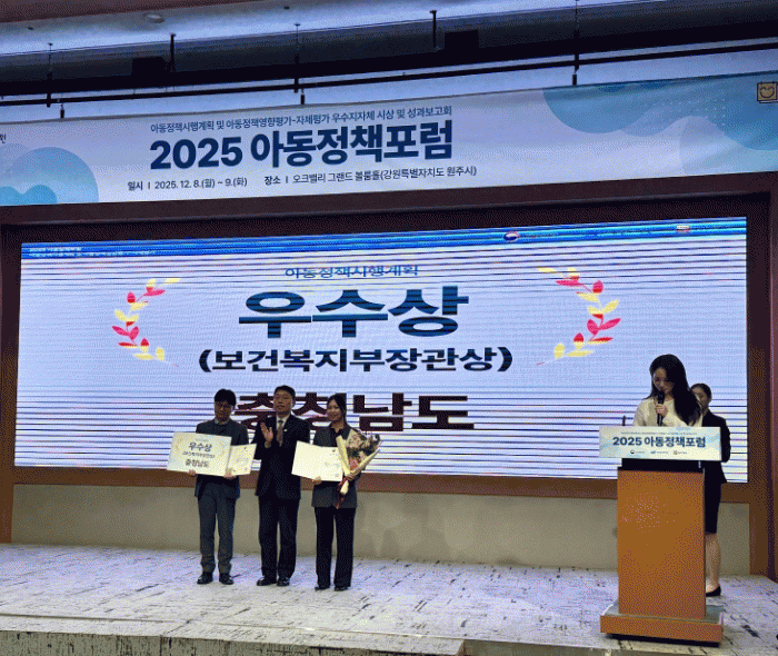 [HKSÇàÁ¤¹æ¼Û] Ãæ³²µµ°¡ ¾Æµ¿Á¤Ã¥ ½ÃÇà°èȹ ÃßÁø ½ÇÀûÀÇ ¿ì¼ö¼ºÀ» Àü±¹¼ ÀÎÁ¤¹ÞÀ¸¸ç ¡®¾ÆÀÌ Å°¿ì±â ÁÁÀº Ãæ³²¡¯ÀÇ À§»óÀ» ´Ù½Ã Çѹø ÀÔÁõÇß´Ù. µµ´Â Áö³ 8ÀÏ ¿øÁֽà ¿ÀÅ©¹ë¸® ¸®Á¶Æ®¿¡¼ ¿¸° ¡®2025³â Á¦13ȸ ¾Æµ¿Á¤Ã¥Æ÷·³¡¯¿¡¼ ¡¦