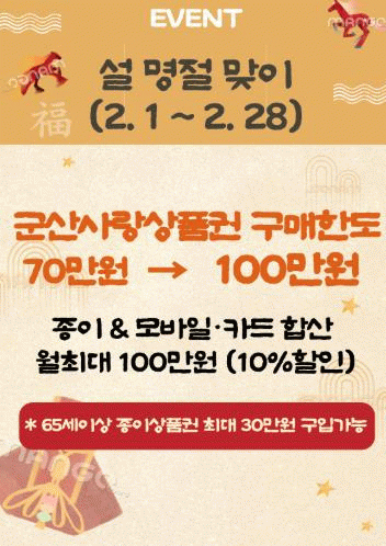 [HKSÇàÁ¤¹æ¼Û]±º»ê½Ã°¡ ¼³ ¸íÀýÀ» ¸Â¾Æ 2¿ù ÇÑ ´Þ°£ ±º»ê»ç¶û»óǰ±ÇÀÇ 1ÀÎ´ç ¿ù ±¸¸Å Çѵµ¸¦ ±âÁ¸ 70¸¸ ¿ø¿¡¼ 100¸¸ ¿øÀ¸·Î ÇѽÃÀûÀ¸·Î Àü°Ý »óÇâÇÑ´Ù°í 26ÀÏ ¹àÇû´Ù. À̹ø »ç¾÷Àº ¼³ ¸íÀý ¼Òºñ ÁýÁß ½Ã±â¿¡ ¸ÂÃç ¡â°¡°è ºÎ´ã ¿ÏÈ ¡â¼Ò¡¦
