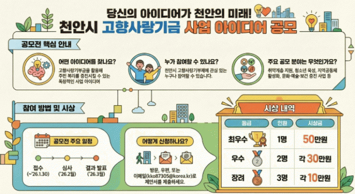 [HKSÇàÁ¤¹æ¼Û] õ¾È½Ã°¡ °íÇâ»ç¶û±âºÎÁ¦ ±â±Ý»ç¾÷ ¾ÆÀ̵ð¾î °ø¸ðÀüÀ» ½Ç½ÃÇÑ´Ù°í 29ÀÏ ¹àÇû´Ù.