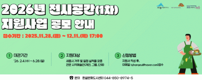 [HKSÇàÁ¤¹æ¼Û] ¼¼Á¾½Ã¹®È°ü±¤Àç´Ü Çѱ۹®Èµµ½Ã¼¾ÅÍ´Â 11¿ù 28ÀϺÎÅÍ 12¿ù 11ÀϱîÁö Áö¿ª ½Ã°¢¿¹¼ú*ÀÎÀÇ Ã¢ÀÛȰµ¿À» Áö¿øÇϱâ À§ÇØ ¡®2026³â Àü½Ã°ø°£ Áö¿ø»ç¾÷(1Â÷)¡¯ °ø¸ð¸¦ ÁøÇàÇÑ´Ù.