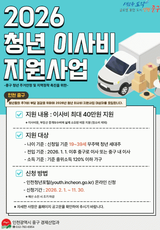 [¼öµµ±Ç] û³â ÁÖ°Å ºÎ´ã ¿ÏÈ­ ³ª¼± ÀÎõ Áß±¸, ÀÌ»çºñ ÃÖ´ë 40¸¸ ¿ø Áö¿ø |2026. 01.26
