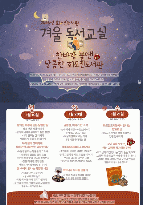 [HKSÇàÁ¤¹æ¼Û]ÀÎõ±¤¿ª½Ã±³À°Ã»ÈµµÁøµµ¼°üÀº °Ü¿ï¹æÇÐÀ» ¸Â¾Æ ÃʵîÇб³ 3~4ÇгâÀ» ´ë»óÀ¸·Î 2026³â 1¿ù 19ÀϺÎÅÍ 21ÀϱîÁö °Ü¿ïµ¶¼±³½ÇÀ» ¿î¿µÇÑ´Ù.