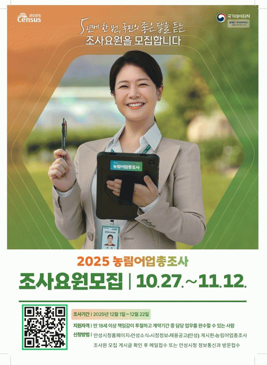 [¼öµµ±Ç] ¾È¼º½Ã, 2025 ³ó¸²¾î¾÷ÃÑÁ¶»ç Åë°èÁ¶»ç¿ø ä¿ë |2025. 10.27