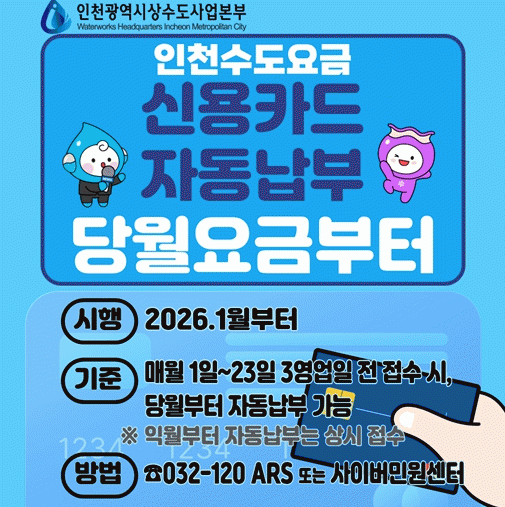 [¼öµµ±Ç] ÀÎõ½Ã, »õÇØºÎÅÍ ¼öµµ¿ä±Ý ½Å¿ëÄ«µå ÀÚµ¿³³ºÎ ÆíÀǼº ´õ¿í °È |2026. 01.02