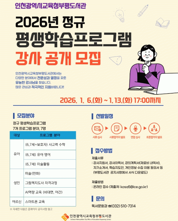 [¼öµµ±Ç] ÀÎõ±¤¿ª½Ã±³À°Ã»ºÎÆòµµ¼°ü, 2026³â Á¤±Ô Æò»ýÇнÀÇÁ·Î±×·¥ °»ç ¸ðÁý |2026. 01.07