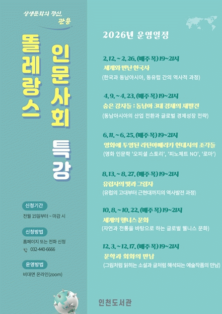 [HKSÇàÁ¤¹æ¼Û]ÀÎõ±¤¿ª½Ã ÀÎõµµ¼°üÀº ÀÏ¹Ý ½Ã¹ÎÀ» ´ë»óÀ¸·Î Àι®ÇÐÀû ¼Ò¾ç°ú »çȸÀû ÅëÂûÀ» ÇÔ¾çÇϱâ À§ÇÑ ¡®2026³â ¶Ê·¹¶û½º Àι®»çȸ Ư°¡¯À» ¿î¿µÇÑ´Ù°í ¹àÇû´Ù. ¡®¶Ê·¹¶û½º Àι®»çȸ Ư°¡¯Àº 2021³âºÎÅÍ Çѱ¹¿Ü±¹¾î´ëÇб³ ±¹Á¦Áö¡¦
