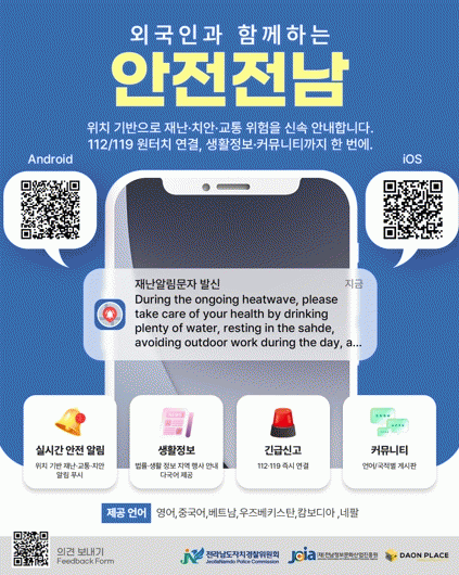[HKSÇàÁ¤¹æ¼Û]Àü¶ó³²µµÀÚÄ¡°æÂûÀ§¿øÈ¸´Â Àü³² ü·ù ¿Ü±¹ÀÎÀÇ ¾ÈÀü »ç°¢Áö´ë¸¦ ÇØ¼ÒÇÏ°í ¾ð¾î À庮¿¡ µû¸¥ Àç³À̳ª ¹üÁË ´ëÀÀÀÇ ¾î·Á¿òÀ» ÁÙÀ̱â À§ÇØ ¡®´Ù±¹¾î ¾ÈÀüÀü³²¡¯ ¾ÛÀ» °³¹ß, º»°Ý ¼ºñ½ºÇÑ´Ù°í ¹àÇû´Ù. ¡®´Ù±¹¾î ¾ÈÀüÀü³²¡¯ ¾Û¡¦
