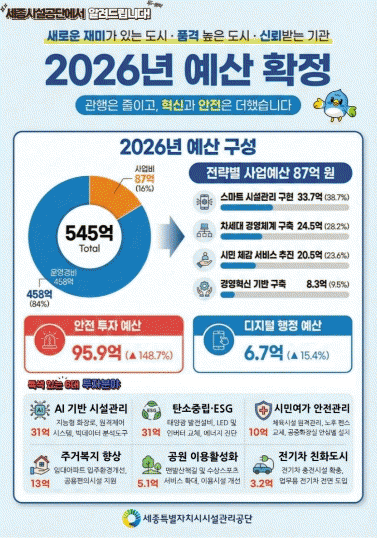 [ÃæÃ»±Ç] ¼¼Á¾½Ã¼³°ø´Ü, 2026³â ¿¹»ê 545¾ï È®Á¤, ¡°°üÇàÀû ÁöÃâ ´ú¾î³»°í ½Ã¹Î Çູ¿¡ ¿ªÁ¡ ÅõÀÚÇÑ´Ù.¡± |2025. 12.29