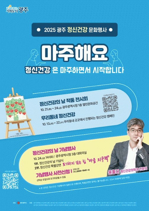 [HKSÇàÁ¤¹æ¼Û]±¤ÁÖ±¤¿ª½Ã´Â ¡®Á¤½Å°Ç° È«º¸ÁÖ°£¡¯(10¿ù 10~24ÀÏ)À» ¸Â¾Æ ½Ã¹ÎÀÇ ¸¶À½ °Ç° ÁõÁøÀ» À§ÇÑ ´Ù¾çÇÑ ¹®ÈÇà»ç¸¦ ¿¬´Ù.