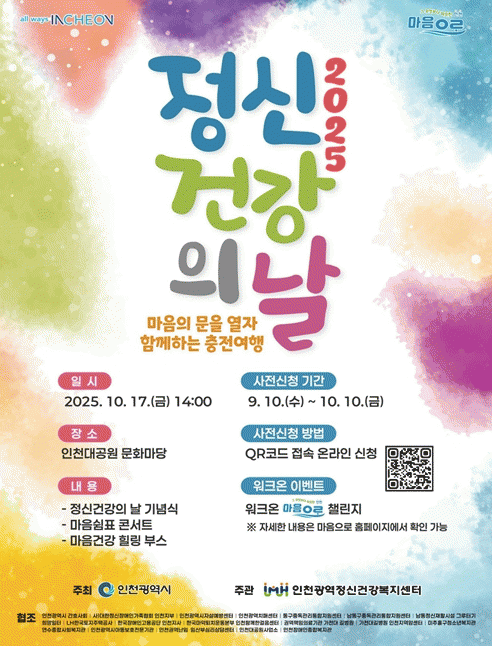 [HKSÇàÁ¤¹æ¼Û]ÀÎõ±¤¿ª½Ã´Â 10¿ù 17ÀÏ ÀÎõ´ë°ø¿ø ¹®È¸¶´ç¿¡¼ ¡®¸¶À½ÀÇ ¹®À» ¿ÀÚ, ÇÔ²²ÇÏ´Â ÃæÀü ¿©Ç࡯À̶õ ÁÖÁ¦·Î¡®2025³â Á¤½Å°Ç°ÀÇ ³¯ ±â³äÇà»ç¡¯¸¦ °³ÃÖÇÑ´Ù.