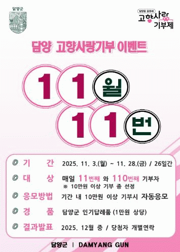 [HKSÇàÁ¤¹æ¼Û] ´ã¾ç±ºÀÌ 11¿ùÀ» ¸ÂÀÌÇØ 3ÀϺÎÅÍ 28ÀϱîÁö ¸ÅÀÏ 11¹øÂ°, 110¹øÂ° °íÇâ»ç¶û ±âºÎÀÚ¿¡°Ô Àα⠴ä·ÊǰÀ» ÁõÁ¤ÇÏ´Â À̺¥Æ®¸¦ ÁøÇàÇÑ´Ù. º» À̺¥Æ®´Â ÇØ´ç ±â°£ ³» ´ã¾ç±º¿¡ 10¸¸ ¿ø ÀÌ»ó ±âºÎ¸¦ ÇÏ´Â °æ¿ì ÀÚµ¿ ÀÀ¸ðµÇ¸ç, ¸Å¡¦