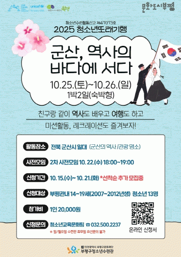 [¼öµµ±Ç] ºÎÆò±¸Ã»¼Ò³â¼ö·Ã°ü, ¡®2025 û¼Ò³â¶Ç·¡±âÇà- ±º»ê, ¿ª»çÀÇ ¹Ù´Ù¿¡ ¼´Ù¡¯ Âü°¡ÀÚ ¸ðÁý |2025. 10.17