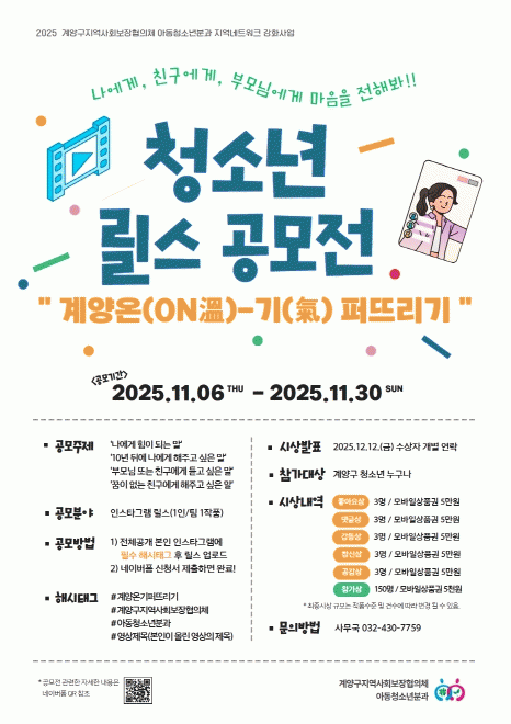 [¼öµµ±Ç] °è¾ç±¸Áö¿ª»çȸº¸ÀåÇùÀÇü ¾Æµ¿Ã»¼Ò³âºÐ°ú, ¡®°è¾ç ¿Â(ONè®)-±â(Ѩ) ÆÛ¶ß¸®±â¡¯ û¼Ò³â ¸±½º °ø¸ðÀü °³ÃÖ |2025. 11.13