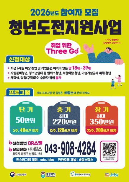 [HKSÇàÁ¤¹æ¼Û]ÃæºÏ°æÁ¦ÀÚÀ¯±¸¿ªÃ»Àº ±¸Á÷ ÀÇ¿åÀÌ ³·¾ÆÁø µµ³» û³âµéÀÇ ¿øÈ°ÇÑ »çȸ ÁøÃâÀ» µ½±â À§ÇØ °í¿ë³ëµ¿ºÎ°¡ ÁÖ°üÇÏ´Â ¡®2026³â û³âµµÀü Áö¿ø»ç¾÷¡¯ÀÇ ±¹ºñ 11¾ï 6,000¸¸ ¿øÀ» È®º¸ÇÏ°í º»°ÝÀûÀÎ Âü¿©ÀÚ ¸ðÁý¿¡ ³ª¼±´Ù°í ¹àÇû´Ù.¡¦ |