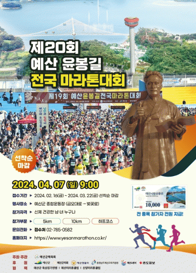 [ÃæÃ»±Ç] ¿¹»ê±º, Á¦20ȸ ¿¹»êÀ±ºÀ±æ Àü±¹¸¶¶óÅæ´ëȸ 4¿ù 7ÀÏ °³ÃÖ |2024. 02.16