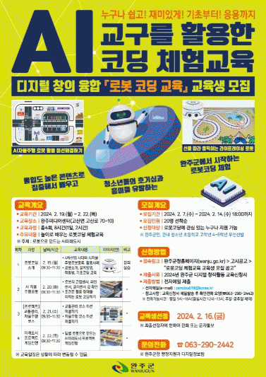 [HKSÇàÁ¤¹æ¼Û]¿ÏÁÖ±ºÀÌ 4Â÷ »ê¾÷½Ã´ë¸¦ ÁÖµµÇÏ´Â µðÁöÅÐ ±â¼úÀÇ º¯È¿Í »õ·Î¿î Æ®·»µå¿¡ ÀûÀÀÇϱâ À§ÇØ Ã»¼Ò³â ´ë»ó(ÃʵîÇлý 4~6Çгâ) µðÁöÅРâÀÇÀ¶ÇÕ SW¡¤AI ·Îº¿ÄÚµù üÇè±³À°À» ¿î¿µÇÑ´Ù. 6ÀÏ ¿ÏÁÖ±º¿¡ µû¸£¸é ·Îº¿ÄÚµù ±³À°Àº ¿À¡¦