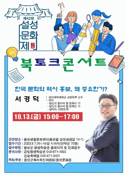 [HKSÇàÁ¤¹æ¼Û]À½¼º±º°ú À½¼º¹®È¿øÀº ¼³¼º¹®ÈÁ¦ ÇÁ·Î±×·¥ ÀÏȯÀ¸·Î 10¿ù 13ÀÏ 15½Ã »ýȰ¹®È¼¾ÅÍ¿¡¼ ¼°æ´ö ±³¼ö¸¦ ÃÊÃ»ÇØ ¡®Çѱ¹ ¹®È¿Í ¿ª»ç È«º¸, ¿Ö Áß¿äÇѰ¡?¡¯¶ó´Â ÁÖÁ¦·Î ºÏ ÅäÅ© ÄܼƮ¸¦ °³ÃÖÇÑ´Ù.