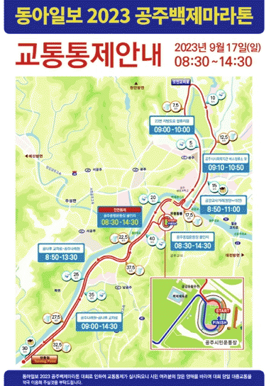 [HKSÇàÁ¤¹æ¼Û]°øÁֽð¡ ¿À´Â 17ÀÏ ¿¸®´Â ¡®2023 °øÁÖ¹éÁ¦¸¶¶óÅæ´ëȸ¡¯ ´çÀÏ ¸¶¶óÅæ ÁÖÇà ÀϺΠ±¸°£¿¡ ´ëÇØ ±³ÅëÀ» ÅëÁ¦ÇÑ´Ù°í 13ÀÏ ¹àÇû´Ù. ½Ã´Â ´ëȸ°¡ ½ÃÀ۵Ǵ °øÁÖ ½Ã¹Î¿îµ¿Àå ÁÖº¯Àº ¿ÀÀü 8½Ã 30ºÐºÎÅÍ ¿ÀÈÄ 2½Ã 30ºÐ±îÁö Â÷·® ¿î¡¦