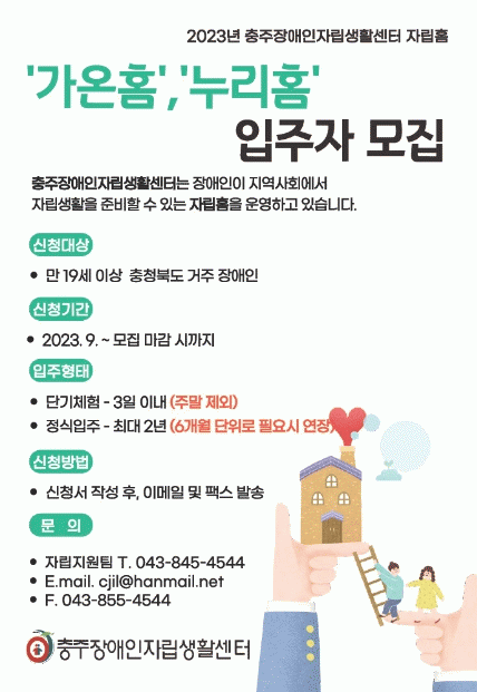 [ÃæÃ»±Ç] ÃæÁÖÀå¾ÖÀÎÀÚ¸³»ýȰ¼¾ÅÍ, ÀÚ¸³È¨ '°¡¿ÂȨ','´©¸®È¨' ÀÔÁÖÀÚ ¸ðÁý |2023. 09.11
