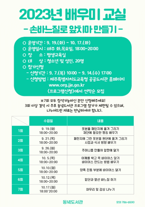 [HKSÇàÁ¤¹æ¼Û]Á¦ÁÖµµ±³À°Ã» µ¿³èµµ¼°üÀº ´Ù¾çÇÑ Æò»ý±³À°ÇÁ·Î±×·¥À» ÅëÇØ Áö¿ªÁֹεéÀÇ Ãë¹Ì»ýȰ Áö¿ø ¹× Àڱ⠰è¹ßÀÇ ±âȸ¸¦ Á¦°øÇϱâ À§ÇØ¡®2023³â ¹è¿ì¹Ì ±³½Ç-¹Ù´ÀÁú ±â¹ýÀ¸·Î ¾ÕÄ¡¸¶ ¸¸µé±â¡¯ÇÁ·Î±×·¥À» ¿î¿µÇÑ´Ù.