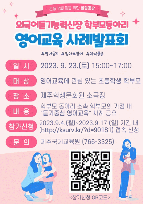 [HKSÇàÁ¤¹æ¼Û]Á¦ÁÖµµ±³À°Ã» Á¦ÁÖ±¹Á¦±³À°¿øÀº ÀÚ³àµéÀÇ ¿µ¾î±³À°¿¡ °ü½É ÀÖ´Â ÃʵîÇб³ Çкθ𸦠´ë»óÀ¸·Î 9¿ù 23ÀÏ¿¡ ¿Ü±¹¾îµè±â´É·Â½ÅÀå Çкθ𠵿¾Æ¸® »ç·Ê¹ßǥȸ¸¦ ½Ç½ÃÇÑ´Ù. »ç·Ê¹ßǥȸ´Â ¿ÀÈÄ 3½ÃºÎÅÍ 5½Ã±îÁö 2½Ã°£ µ¿¾È Á¦ÁÖÇлý¡¦ |
