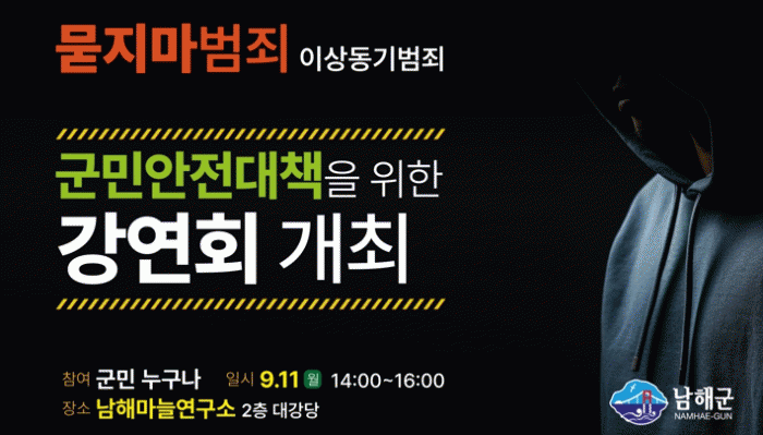 [HKSÇàÁ¤¹æ¼Û]³²ÇرºÀº ¿À´Â 9¿ù 11ÀÏ 14½Ã~16½Ã, ³²Çظ¶´Ã¿¬±¸¼Ò 2Ãþ ´ë°´ç¿¡¼ ¡®¹¯Áö¸¶ ¹üÁË(À̻󵿱⠹üÁË) ±º¹Î¾ÈÀü´ëÃ¥À» À§ÇÑ °¿¬È¸¡¯¸¦ °³ÃÖÇÑ´Ù°í ¹àÇû´Ù.