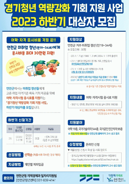 [HKSÇàÁ¤¹æ¼Û]¿¬Ãµ±ºÀº °ü³» ¸¸19~34¼¼ ¹ÌÃë¾÷ û³âÀ» ´ë»óÀ¸·Î Ãë¾÷¿¡ ÇÊ¿äÇÑ ¾îÇÐ(ÀÚ°Ý)½ÃÇè ÀÀ½Ã·á Áö¿ø »ç¾÷ Âü¿©ÀÚ¸¦ ¸ðÁýÇÑ´Ù.