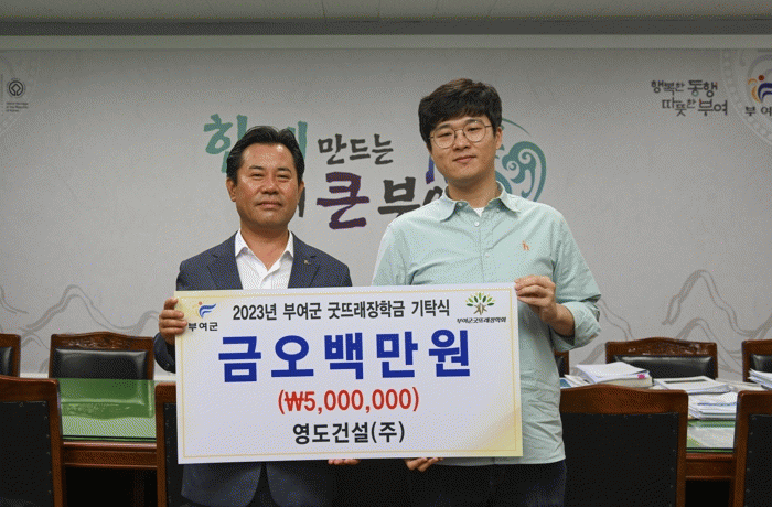 [HKSÇàÁ¤¹æ¼Û]¿µµµ°Ç¼³(ÁÖ)Àº Áö³ 4ÀÏ ºÎ¿©±ºÃ»À» ¹æ¹®ÇØ Áö¿ª ÀÎÀç À°¼ºÀ» À§ÇÑ ÀåÇÐ±Ý 500¸¸¿øÀ» (Àç)ºÎ¿©±º±Â¶ß·¡ÀåÇÐȸ¿¡ ±âŹÇß´Ù.