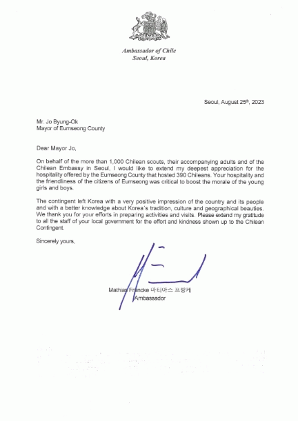 [HKSÇàÁ¤¹æ¼Û]Ä¥·¹´ë»ç°ü ÁÖÇÑ´ë»ç°¡ Àë¹ö¸® ´ë¿øÀ» ȯ´ë¿Í Ä£Àý·Î Áö¿øÇØ ÁØÁ¶º´¿Á À½¼º±º¼ö¿Í ¸ðµç °ü°èÀÚ¿¡°Ô °í¸¿´Ù¸ç °¨»ç ¼Çѹ®À» º¸³»¿Ô´Ù.