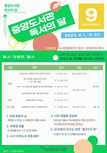 [ÃæÃ»±Ç] ¾Æ»ê½Ã¸³µµ¼°ü, Ã¥ Àбâ ÁÁÀº ¡®9¿ù µ¶¼ÀÇ ´Þ¡¯ Çà»ç ¿î¿µ |2023. 08.30