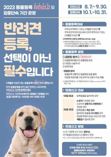 'µ¿¹°º¸È£¹ý' Á¦15Á¶¿¡ µû¶ó ¹Ý·Á°ßÀ» µî·ÏÇÏÁö ¾ÊÀ¸¸é 100¸¸ ¿ø ÀÌÇÏÀÇ °úÅ·ᰡ, ¼ÒÀ¯ÀÚ º¯°æ ¹× ¹Ý·Á°ß »ç¸Á µî º¯°æ »çÇ×ÀÌ ¹ß»ýÇÑ °æ¿ì 30ÀÏ À̳»¡¦ |