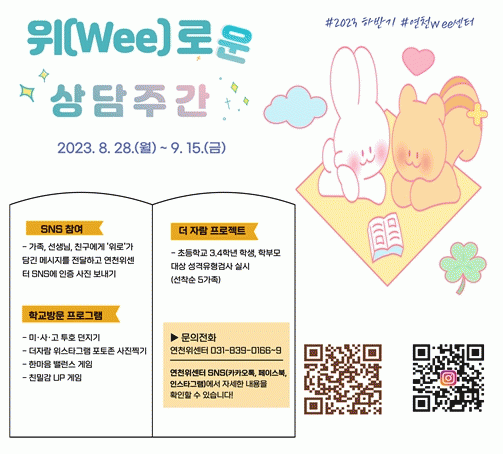 [HKSÇàÁ¤¹æ¼Û]°æ±âµµ¿¬Ãµ±³À°Áö¿øÃ» À§(Wee)¼¾ÅÍ´Â 8¿ù 28ÀϺÎÅÍ 9¿ù 15ÀϱîÁö »ó´ãÁÖ°£ÇÁ·Î±×·¥ ¡®À§(Wee)·Î¿î »ó´ã¡¯À» ¿î¿µÇÑ´Ù. ¿Â¶óÀÎ SNS Âü¿© ÇÁ·Î±×·¥À¸·Î ¡®À§·ÎÀÇ ±Û ÀüÇϱ⡯¸¦ ÁøÇàÇϸç, µî±·±æ°ú Á¡½É½Ã°£ Çб³ ¹æ¹® ÇÁ·Î±×¡¦ |
