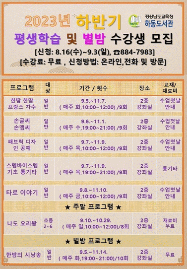 [HKSÇàÁ¤¹æ¼Û]Çϵ¿µµ¼°üÀº Áö¿ªÁÖ¹ÎÀÇ °ÇÀüÇÑ ¿©°¡ ¼±¿ë°ú Æò»ýÇнÀ ºÐÀ§±â Á¶¼ºÀ» À§ÇØ 2023³â ÇÏ¹Ý±â Æò»ýÇнÀ ¹× º°¹ã ÇÁ·Î±×·¥À» ¿î¿µÇÑ´Ù°í 25ÀÏ ¹àÇû´Ù. À̹ø ÇϹݱâ ÇÁ·Î±×·¥Àº ÀÌ¿ëÀÚµéÀÇ ÀǰßÀ» ¼ö·ÅÇØ ÀÚ±â°è¹ßÇÒ ¼ö ÀÖ´Â ½Ç¡¦