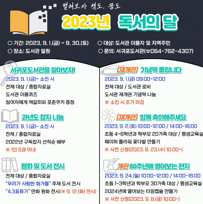 [HKSÇàÁ¤¹æ¼Û]Á¦ÁÖµµ±³À°Ã» ¼±ÍÆ÷µµ¼°üÀº Áö¿ªÁֹεéÀÇ µµ¼°ü ÀÌ¿ëÀ» Ȱ¼ºÈÇϰíÀÚ 9¿ù 1ÀϺÎÅÍ¡®2023³â µ¶¼ÀÇ ´Þ¡¯Çà»ç¸¦ ¿î¿µÇÑ´Ù. ÁÖ¿ä Çà»ç·Î´Â µµ¼°ü Àç°³°üÀ» ±â³äÇÏ¿© Á¾ÀÌ²É ²É´Ù¹ßÀ» ¸¸µé¾î º¸´Â¡®ÇÔ²² ÃàÇÏÇØÁÖ¼¼¿ä¡¯¿Í¡¦