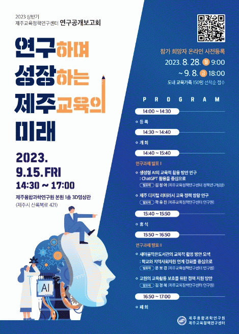 [HKSÇàÁ¤¹æ¼Û]Á¦ÁÖµµ±³À°Ã» Á¦ÁÖÀ¶ÇÕ°úÇבּ¸¿ø Á¦ÁÖ±³À°Á¤Ã¥¿¬±¸¼¾ÅÍ´Â 9¿ù 15ÀÏ 14½Ã 30ºÐºÎÅÍ 17½Ã±îÁö(2½Ã°£ 30ºÐ) º»¿ø 1Ãþ 3D¿µ»ó°ü(»ê·ÏºÏ·Î 421)¿¡¼'2023 »ó¹Ý±â Á¦ÁÖ±³À°Á¤Ã¥¿¬±¸¼¾ÅÍ ¿¬±¸°ø°³º¸°íȸ'¸¦ °³ÃÖÇÑ´Ù. ¡®¿¬±¸Çϸ硦