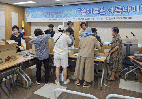 [HKSÇàÁ¤¹æ¼Û]ÇÕõ±ºÀÚ¿øºÀ»çÇùÀÇȸ´Â 22ÀÏ Á¾ÇÕ»çȸº¹Áö°ü 5Ãþ ´Ù¸ñÀû½Ç¿¡ ±è¿ëö ȸÀåÀ» ºñ·ÔÇÑ À¾¡¤¸éȸÀå µî 20¿©¸íÀÌ Âü¼®ÇØ À¾¡¤¸éº° Ãë¾à°èÃþ 340°¡±¸¿¡ Àü´ÞÇÒ ¿©¸§³ª±â ŰƮ¸¦ Á¦ÀÛÇß´Ù.