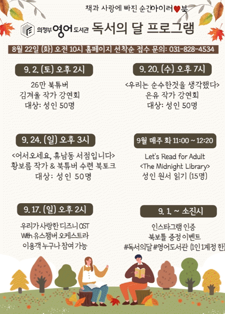 [HKSÇàÁ¤¹æ¼Û]ÀÇÁ¤ºÎ¿µ¾îµµ¼°üÀº µ¶¼ÀÇ ´Þ 9¿ùÀ» ¸Â¾Æ ¡®Ã¥°ú »ç¶û¿¡ ºüÁø ¼ø°£¡¯À̶õ ÁÖÁ¦·Î µ¶¼ÀÇ Áñ°Å¿ò°ú ¼ÒÁßÇÔÀ» ¾Ë·ÁÁÖ´Â ÀÛ°¡ °¿¬È¸¸¦ ºñ·ÔÇØ ¿ø¼ Àбâ, À½¾Çȸ µî ´Ùä·Î¿î µ¶¼¹®È ÇÁ·Î±×·¥À» ¿î¿µÇÑ´Ù.