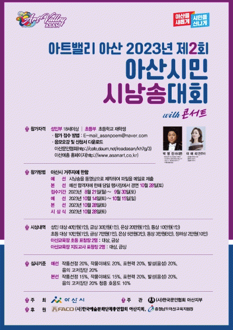 [HKSÇàÁ¤¹æ¼Û]¾Æ»ê½Ã°¡ ÁÖÃÖÇϰí, (»ç)Çѱ¹¹®ÀÎÇùȸ ¾Æ»ê½ÃÁöºÎ°¡ ÁÖ°üÇϸç, (»ç)¾Æ»ê¿¹ÃѰú ¾Æ»ê±³À°Áö¿øÃ»ÀÌ ÈÄ¿øÇÏ´Â ¡®¾ÆÆ®¹ë¸® ¾Æ»ê 2023³â Á¦2ȸ ¾Æ»ê½Ã¹Î ½Ã³¶¼Û´ëȸ¡¯°¡ ¿¹½É(10¿ù 14~15ÀÏ) ¹× º»¼±(10¿ù 28ÀÏ)À¸·Î ³ª´² °³Ãֵȴ١¦ |