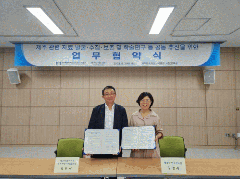 [HKSÇàÁ¤¹æ¼Û]Á¦ÁÖÆ¯º°ÀÚÄ¡µµ ¹Î¼ÓÀÚ¿¬»ç¹Ú¹°°üÀº Á¦ÁÖÇבּ¸¼¾ÅÍ¿Í Á¦ÁÖ °ü·Ã ÀÚ·á¿¡ ´ëÇÑ ¹ß±¼¡¤¼öÁý¡¤º¸Á¸¡¤Çмú¿¬±¸ µîÀ» °øµ¿À¸·Î ÃßÁøÇϱâ À§ÇÑ ¾÷¹«Çù¾àÀ» 3ÀÏ Ã¼°áÇß´Ù. µÎ ±â°üÀº À̹ø ¾÷¹«Çù¾àÀ» ¹ÙÅÁÀ¸·Î µµ³» ¸¶À»º° ÇöÀåÁ¶¡¦